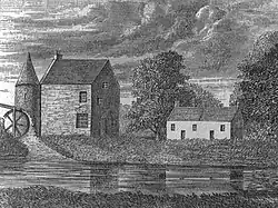 A large number of mills existed along the length of the Annick Water, with only Cunninghamhead Mill still standing today (2006). The Corsehill Mills (corn and wool) were at Stewarton,[15] powered by water from the Corsehill Burn, which arose from the Clerkland Burn. Lambroch Mill was located near Laigh Castleton Farm. Scroaggy or Fairliecrevoch Mill was a waulk mill for preparing cloth and existed until the 1960s, with its lade cutting across the large loop in the river near Ramstane. Downstream from Cunninghamhead was a sawmill and a corn mill existed in Perceton near the old church. Scroag or scrog is a crab apple or gnarled tree stumps in old Scots and this 'nickname' well describes the area where the mill stood. At Galston the Burnanne joins the Irvine. This tributary was famous[7] for its rich jasper pebbles; semi-precious stones, which were collected, cut and polished for use in jewellery. The gravel bed of rivers was an important source of income for millers[16] and others who owned the rights of extraction. The gravel was sold for various farm and horticultural purposes, such as infilling drainage ditches, the surfacing of field entrances and driveways, road surfaces, horticulture, etc.
