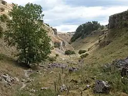 The Lathkill Dale starts just to the east of the small village of Monyash, to the west of Bakewell, and is dry initially. In times of high rainfall the source of the river is Lathkill Head Cave (SK170658), where water which has flowed underground from the Flagg area to the west of Monyash emerges,[2] but in drier conditions the river rises from springs further down the valley.[3] It flows generally eastward, and at Cales Dale it is joined on the right bank by a small tributary. Like the Lathkill, Cales Dale is dry at its upper end, with its stream rising near the bottom end. The river flows over five weirs and a waterfall.[4] To the south of Haddon Grove Farm, an early 19th-century farmhouse[5] there are a series of weirs and sluices, at the start of a long section where the river and its banks are a scheduled monument. The Lathkill Dale and Mandale Mines and soughs have been protected because they are rare examples of lead mining activity preserved in good condition, dating from the 16th to the 19th centuries.[6]