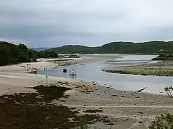 Below the road bridge, the river channel is flanked by white sandy beaches at low tide, known as the Silver Sands of Morar.[10] The River Morar forms the boundary between the parishes of Glenelg, to the north, and Arisaig and Moidart, to the south.[11]