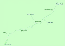Rising on Chelburn Moor (south of Todmorden in the Pennines), the river flows south through Littleborough towards Rochdale where it is joined by the River Beal at Belfield, and the River Spodden from Whitworth. Turning west it runs past Heywood and Bury before meeting the River Irwell at Springwater Park, located just to the east of Radcliffe.