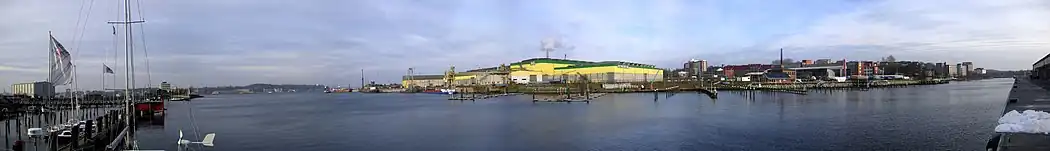 • location | between the Kiel districts of Neumühlen-Dietrichsdorf and Wellingdorf into the Kiel Fjord |