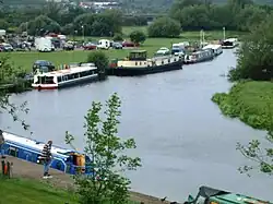 The Soar rises near Wibtoft in Warwickshire, and flows north to join the Soar Brook near Sharnford, it then continues in a north-easterly direction, passing through Croft and between Narborough and Littlethorpe, until on the outskirts of Leicester it is joined by the Sence near Enderby.[4] Before flowing through the centre of the city it meets the Grand Union Canal at Aylestone, where it is also joined by the River Biam. After passing over Freemens Weir, the river splits and recombines with the canal, creating an area of Leicester called Bede Island. The navigable arm that runs to the east has been canalised with parallel banks and is known as 'The Mile Straight'. Beyond Blackfriars, the river splits again to form Frog Island and Abbey Park; it recombines at Belgrave where it passes beside the National Space Centre.