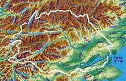 The Tay drains much of the lower region of the Highlands. It originates on the slopes of Ben Lui (Beinn Laoigh), around 25 mi (40 km) from the west coast town of Oban, in Argyll and Bute.[2] In 2011, the Tay Western Catchments Partnership determined as its source ( based on its 'most dominant and longest' tributary) a small lochan on Allt Coire Laoigh south of the summit.[3] The river has a variety of names in its upper catchment: for the first few miles it is known as the River Connonish; then the River Fillan; the name then changes to the River Dochart until it flows into Loch Tay at Killin.
