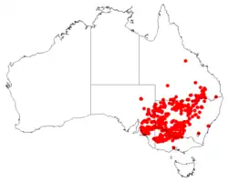 The black box is widespread in Queensland, New South Wales, Victoria and South Australia, especially in grassy woodland on the floodplains of the Murray–Darling basin, but usually in dryer sites than river red gum (E. camaldulensis). The total area occupied by E. largiflorens prior to colonisation was 517,812 km2 (199,928 sq mi) but has now been reduced to 293,631 km2 (113,372 sq mi) and the population is now severely fragmented. The International Union for the Conservation of Nature listed it as a vulnerable species in 2019.[1]