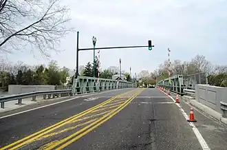 The Riverside–Delanco Bridge is a truss bridge with a central swing span that carries CR 543 across the Rancocas Creek, between Riverside and Delanco in New Jersey. The current bridge was built in 1934-1935 to replace the 1901 bridge, which itself replaced an 1870 structure. It is currently managed by the Burlington County Bridge Commission.