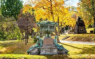 The Elton Memorial Vase sits at the entrance of the cemetery.[6] It was designed by George Edwin Bissell and cast by Fonderia Galli in 1905.[10] The bronze monument depicts four scenes from the Life of Christ. The first side depicts the adoration of the Wise Men; the second side, the Crucifixion; the third side, the entombment; and the fourth side, the Resurrection. Decorative figures carrying wreaths form the handles with the vase supported by cherubs. The large bronze figures on the side of the vase depict Grief and Faith.[11]