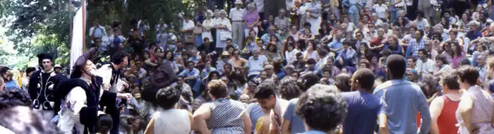 Shakespeare at the Delacorte always disappoints me because it's overmiked and not in tune with park life; but I saw a charming Midsummer Night's Dream by the Riverside Shakespeare Company: no mikes, no lights, no seats; only clever placement at the bottom of Soldier and Sailors Monument to give the audience a view from the steps; broad acting and old-fashioned projection so that everyone could follow; an ability to capitalize on the audience's pre-disposition to enjoy itself; the flexibility to deal with dogs, kids, jets, and drunks; and splendid timing – the play ended as the sun went down.[12]