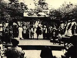 In its second summer, 1978, the company presented a popular free tour of A Midsummer Night's Dream, with Eric Hoffmann as Puck, Karen Hurley as Titania, and Eric Conger as Oberon, directed by Gloria Skurski.[10] An original score by Deborah Awner was performed by the touring group "Brass".[11] The production continued the tradition of un-miked Shakespeare, making use of a sheet-steel touring set for natural amplification of both actors and musicians.[12]
