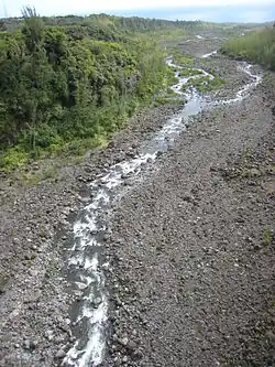 The Rivière de l'Est flows down the slopes of the shield volcano Piton de la Fournaise from an elevation of 720 metres (2,350 ft) above sea level.