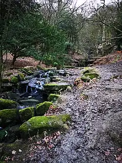Prior to the reservoirs the valley of Rivington was mostly farmland, with little natural woodland, a small village with stone cottages, and a pub. The valley had a stream flowing through, crossed by packhorse bridges. Lester Mill was located near the upper reservoir and there was a mill utilising water power once located where now stands the village hall. The mill was used as a smithy in the 19th to early 20th century.[33] A further water mill was located at Rivington Hall. In the 19th century, farming was reduced with the construction of reservoirs.[33] The area of the Rivington Unitarian Chapel is named Mill Hill on the 1848 OS map and extended to Croft Bridge, crossing Hall Brook. The Victorian 'School Houses' became known as Mill Hill cottages.[15] Mill Dam wood is at the rear of the Vicarage - a pond existed there prior to the reservoir construction. On the watercourse is a ruin that could be a former water wheel house.[34][35]