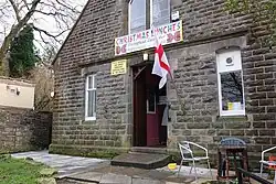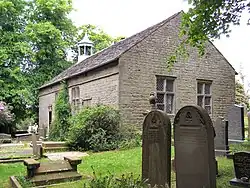 The chapel is a plain structure, originally with a Thatched roof which remained repaired as late as 1790.[25] The building is of local gritstone with quoins at the corners and now has a slate roof.[26] It has a small, hexagonal bellcote on the west gable, the bell is recorded as being purchased in 1876.[27] The side walls have two cross-windows with rectangular panes of glass and the gable walls have windows with small diamond-latticed panes of glass. On the south side are two doorways with chamfered surrounds; over one door is a lintel dated 1703. At the north-west corner is a two-storey wing with a tall chimney stack, which was the school house.[3] The building is surrounded by a drystone wall and the chapel's original bell and its cast iron gates dating to 1816 survive.[26][9]
