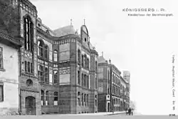 Reflecting the increasing influence of Königsberg's labor movement, the Gewerkschafthaus was inaugurated in Vorder-Roßgarten in May 1914. The spacious three-story building was designed by Waldemar Kuckuck and contained offices for political parties and trade unions. The hall contained a bust of the socialist leader Ferdinand Lassalle. Its coffeehouse, the Kaffeegarten, had a pleasant view over the Schlossteich.[8] The city's social democratic newspaper, the Königsberger Volkszeitung, was published in the Gewerkschafthaus. The building was occupied by the Nazi Party during Gleichschaltung and renamed the Braunes-Haus.