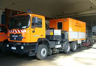 The Unimog road-railer is used for maintenance and shunting tasks.[39] It can pull up to 1000t and operate a snow cutter. Unimog can drive on standard gauge, as well as various international broad gauges, with its own wheels. The mechanical engine power of the Unimog is 160 kW and it achieves a speed of 90 km/h on roads and 50 km/h on rails. It needs a leveled area 5 m long for a rail/road changeover.