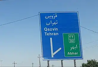 Road 32 is a road in the northwest of Iran . This road goes parallel and in line with Freeway2 from Tehran to Karaj, Hashtgerd, Abyek, Qazvin, Takestan, Abhar, Khorramdarreh, Zanjan, Mianeh, Tabriz, Marand, Mako and finally to Bazargan and the Turkey border . This road is a part of the Asian highway1, which is 260 km long, and connects Tabriz to Bazargan connects Iran and Turkey border . This road passes through six provinces of Tehran, Alborz, Qazvin, Zanjan, East Azerbaijan and West Azerbaijan and is 880 km long.[1]
