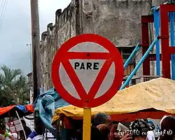 Unlike most countries in the world that use an octagonal stop sign, Cuba still uses a circular stop sign with a red inverted triangle and it is defined in the Vienna Convention on Road Signs and Signals as B2b. This convention still allows an older style of stop sign.