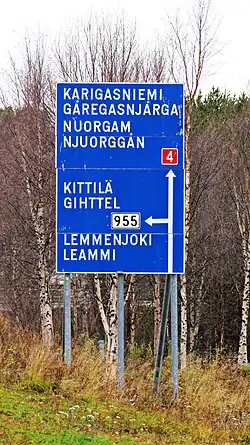 Most signs are based on pictograms, except signs like the prohibition-sign for stop at customs and the sign indicating a taxi rank. If the sign includes text, the text is written in Finnish or Swedish, except the stop sign and taxi signs which are written in English (some taxi signs are written TAKSI in Finnish). Many roads and places in Finland have Finnish and Swedish names, so both are marked on the traffic signs. This is common in the Swedish-speaking areas on the southern and western coasts, whereas in the inland Swedish names are far less common. In northern Lapland there are also traffic signs in the Northern Sámi, Skolt Sámi and Inari Sámi languages.
