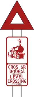 The first warning signs accorded to a standard laid out in the 1926 Road Signs and Traffic Signals Regulations.[14] These signs, unlikely to exist in situ anywhere in Ireland nowadays, were similar to signs used in the United Kingdom at that time. The signs were cast-iron plates, with raised type painted red on white. A square pictogram illustrated the hazard, and the type of hazard was written in both Irish, with traditional typeface, and English. A hollow red triangle normally surmounted the pole to which the sign was attached.