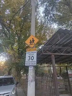 Modern road signs in Uzbekistan are in many ways similar in design to road signs used in Russia and are based on the Soviet ГОСТ 10807-78[5] standard (no longer valid in Russia since January 1, 2006) and the Russian ГОСТ Р 52290-2004 standard.[6][7] The ГОСТ 10807-78 standard is still valid in Uzbekistan, but with additions. However, modern road signs in Uzbekistan also have some design features used on road signs in European countries such as Spain, Germany and Italy.[8] Inscriptions on road signs in Uzbekistan are written in Latin script only, despite the use of Cyrillic and Latin alphabets in the country.