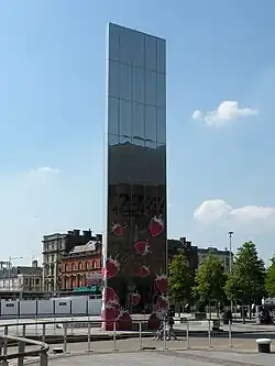 At the north end of the plass is the Water Tower, which is approximately 70 feet (21 m) high with an intermittent stream of water running down the metallic fountain. The tower was also designed by Nicholas Hare Architects[5] in conjunction with the sculptor, William Pye.[7]