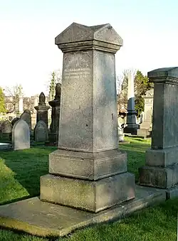 The first part of the burial service was taken by the Reverend A.H. Rix, who met the hearse at the gate, and followed it to the cemetery's Anglican chapel.[31][32] Afterwards, the second part of the service took place at the graveside, and the coffin was placed in the family vault within the cemetery.[31] The plate on Ackrill's coffin said: "Robert Ackrill. Died June 22, 1894. Aged 77 years".[7]