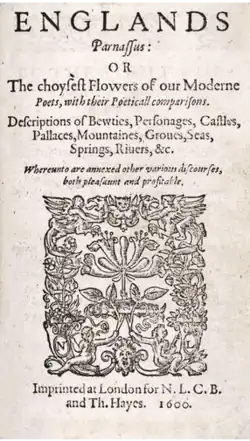 England's Parnassus is a thick octavo volume of some five hundred pages. The extracts are arranged alphabetically under subject-headings, and the author's name is appended in each case. Bullen writing in the DNB in 1885 states that had been twice reprinted; first in Park's ponderous Heliconia, 1815, and again, for private circulation, by Collier, 1867.[4]