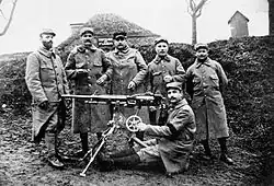 The declaration of war in 1914 signaled a major break in European cultural history, and a major break in the life and career of Robert Antoine Pinchon, who was mobilised on 5 August 1914 at Bernay. Pinchon was wounded in his right leg by a German mortar discharge during the First Battle of the Marne and was repatriated to a hospital in Saint-Céré. Once recovered, he was sent back to the front lines, but during fierce fighting in the village of Tahure on 6 October Pinchon was wounded, this time by shrapnel to the right arm.[4]
