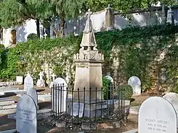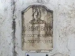 His body was buried by the British Consul William Mark in the English Cemetery in Málaga, which had been completed four months earlier.[4][5] Robert Boyd was the second person buried in the English Cemetery,[6][7] the first within the walls of the primitive cemetery.[8]