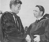 Byrd began night classes at American University Washington College of Law in 1953, while a member of the United States House of Representatives. He earned his Juris Doctor degree cum laude a decade later,[13] by which time he was a U.S. Senator. President John F. Kennedy spoke at the commencement ceremony on June 10, 1963, and presented the graduates their diplomas, including Byrd. Byrd completed law school in an era when only three years of undergraduate education were required. He later decided to complete his Bachelor of Arts degree in political science, and in 1994 he graduated summa cum laude from Marshall University.[3]