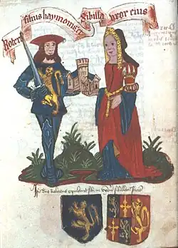 Robert Filius Haymonis et Sibilla uxor eius ("Robert son of Hamon (d.1107) and Sibilla (de Montgomery) his wife"). They are shown jointly giving the church building of Tewkesbury Abbey, of which they were founders. He wears a tabard showing attributed arms of: Azure, a lion rampant guardant or. Underneath below his wife is shown a shield of: quarterly 1 & 4: Azure, a lion rampant guardant or; 2&3: Gules a cross or (Oddo and Doddo, Dukes of Mercia, Saxon founders of Tewkesbury Abbey[1])impaling: Gules, a lion rampant or. Bodleian Library Manuscript: Top. Gloucester, d. 2, Founders' and benefectors' book of Tewkesbury Abbey, made in Tewkesbury c.1500-1525 | |