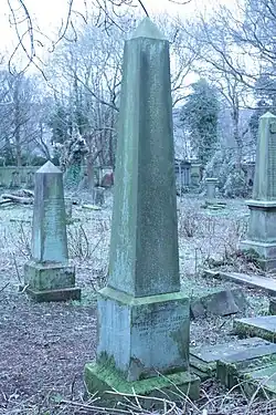 He is buried in Warriston Cemetery in the north of the city. The grave is marked by an obelisk and stands on a diagonal path around 100m from the sealed eastern entrance.