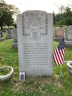 Dietz joined the Army from his birthplace of Kingston, New York in March 1942,[1] and by March 29, 1945, was serving as a staff sergeant in Company A, 38th Armored Infantry Battalion, 7th Armored Division. On that day, during an attack on Kirchhain, Germany, he single-handedly killed several German soldiers defending a bridge into the city and then disabled demolition charges which had been placed under a second bridge. He was killed by enemy fire immediately afterwards, but had successfully cleared the way for the American troops to enter the city. For these actions, he was posthumously awarded the Medal of Honor nine months later by President Harry Truman, on December 17, 1945. Dietz Memorial Stadium in Kingston is named in his honor and memory.