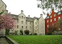 Early projects included the rebuilding of Eaglescarnie, near Haddington and the restoration of Acheson House in Edinburgh. He restored Lambs House in Leith and Hamilton House in East Lothian in 1937.[10] His firm also undertook work in Old Aberdeen and in the West Highlands. During the Second World War, Hurd worked with fellow architect Alan Reiach on a book for the Saltire Society entitled Building Scotland – Past and Future, a pictorial appeal for post-war Scotland to be planned and designed bravely.[11] In 1952 he received a major commission to replan and rebuild Edinburgh's Canongate, largely demolishing buildings and setting back the rebuilt facades to a new wider and straighter building line. Less care was taken over the rear elevations. The scale of the work required him to take on Ian Begg as a junior partner in 1953. He campaigned against the loss of George Square and in 1959 he was commissioned to restore the west side for University use. He was strongly interested in the arts and also helped found the Scottish Georgian Society, was an advisor to the BBC in Scotland, and helped to set up the Edinburgh Festival. His only noteworthy project of contemporary rather than historic idiom is a scheme of modernist flats at Ravelston Gardens, Edinburgh.