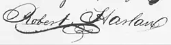 Robert James Harlan was born on December 12, 1816, probably in Mecklenburg County, Virginia. His father was the slave owner of his mother,[1] Mary Harlan,[2] and himself. His mother was also of mixed-race, and Robert was not easily identifiable as black. Early in his life, perhaps at the age of eight,[1] or three[3] Robert and his mother were sent to Cincinnati. The trip was made on foot, before the advent of railroad connections, and when they reached Danville, Kentucky, they received word that Robert's father had died and they were seized as parts of his property to be sold. Robert was purchased by James Harlan of Danville and his mother was sold South.[4] James Harlan worked in dry goods, and became a lawyer and politician, serving in the U.S. House of Representatives from Kentucky from 1835 to 1839. His son, John Marshall Harlan, born in 1833, served as a US Supreme Court Justice from 1877 to 1911 and was known as the "Great Dissenter" for his support of civil rights against the segregationist majority court. The role of Robert Harlan in John Marshall's ideas is discussed in detail in Gordon (2000).[5] It was then that Robert took the name Harlan.[3]