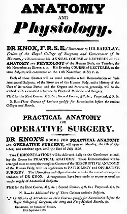 Almost immediately after the Burke and Hare case, the Royal College of Surgeons of Edinburgh began to harry him, and by June 1831 they had procured his resignation as curator of the museum he had proposed and founded.[27] In the same year he was obliged to resign his army commission to avoid further service in the Cape.[28] This removed his last source of guaranteed income, but his classes were more popular than ever, with a record 504 students.[29] His school moved to the grander premises of Old Surgeons' Hall in 1833 but his class declined after Edinburgh University made its own practical anatomy class compulsory in the mid-1830s.[30][31] Knox continued to purchase cadavers for his dissection class from such shadowy figures as the 'Black Bull Man', but after the 1832 Anatomy Act made bodies more available to all anatomists, he quarrelled with HM Inspector of Anatomy over the supply of bodies, and his competitive edge was lost.[32][33] In 1837 Knox applied for the chair in pathology at Edinburgh University but his candidature was blocked by eleven existing professors, who preferred to abolish the post rather than appoint him.[34] In 1842 he was unable to make payments to the Edinburgh funeratory system, from which bodies were supplied to private schools, and he relocated to Glasgow where, still short of subjects for dissection, he closed his school in 1844. In 1847 the Royal College of Surgeons of Edinburgh found him guilty of falsifying a student's certificate of attendance (not an uncommon practice in private schools) and refused to accept any further certificates from him, effectively banning him from teaching in Scotland.[35] In the same year he was expelled from the Royal Society of Edinburgh and had his election retrospectively cancelled.[36]