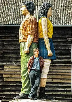 A 14ft cedar woodcarving titled Boy and Girl sat on a roundabout in Kents Hill, Milton Keynes in 1997. Koening regularly worked on large scale carved and painted wood relief panels such as the 'Blue Portal no. 7' purchased by the Buckinghamshire County Museum in Aylesbury in 1997 and the smaller 'Rustic Umbrellas'[4] purchased by the Arts Council of Great Britain.[5] He was one of the first artists to be invited to participate in the Grizedale Forest Sculpture Project in the Lake District of England. He spent seven months during 1982–83 living and working in a forest environment and left behind six sculptures as his personal response to this landscape. The Grizedale Forest Sculpture Project was initiated in 1977 and has influenced a generation of sculptors and helped transform the way sculpture is seen and made and understood in public places.