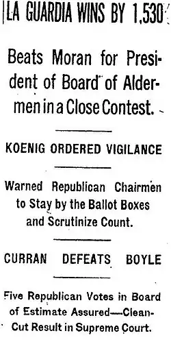 Although Moran had been the heavy favorite going into the election,[18] and despite the absence of Kelly's name on the ballot, when Election Day arrived, more than 3,500 of Kelly's supporters wrote his name on the ballot.[15] This was sufficient to defeat Moran, who lost to LaGuardia by 1,363 votes. The election of 1919 was devastating to Tammany, and also brought defeat to Edward F. Boyle in the contest for the Manhattan Borough presidency.[19]