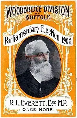 In 1880 Everett stood unsuccessfully for Parliament at East Suffolk[2] as a farmers' candidate.[3] He was elected as Member of Parliament (MP) for Woodbridge at the 1885 general election but lost the seat in 1886.[4] He was elected again in 1892, but lost in 1895. He won the seat for the third time in 1906 but did not seek re-election in January 1910.[4]