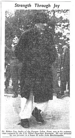 Ley was captured by American paratroopers near the Austrian border at the end of the war. He died by suicide in October 1945 while awaiting trial at Nuremberg for crimes against humanity and war crimes.[1]