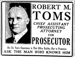 Toms ran for the office of Prosecuting attorney of Wayne County in 1915; he was unsuccessful.[11] The primary election for the Republican nomination was stuck in legal battles.[11] Toms filed a motion in the circuit court to restrain/stop the election commission from counting votes of Charles H. Jasnowski, Guy A Miller and Proctor K. Owens.[11] It was claimed that the men's names were on the ballots in violation of the law. The court of appeals stated in a unanimous decision, which held "if there was any error in printing the names on the ballots, the great mass of voters should not be disfranchised because they voted in good faith.[11]
