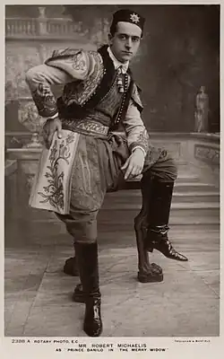 An early appearance in musical theatre came in 1907, when Michaelis sang in Gustave Kerker's The White Hen at the Casino Theatre, New York, in a run lasting three months.[5] In 1908, he took over the part of Prince Danilo in The Merry Widow for the last four months of its run at Daly's Theatre,[6] then was cast as Freddy Fairfax in The Dollar Princess (1909), becoming a favourite at Daly's,[3] and playing a leading role in The Marriage Market (1911). In 1912, he sang the title role in an English production of Franz Lehár's operetta The Count of Luxembourg,[7] as one of the five principals, together with Phyllis Le Grand, Eric Thorne, Lauri de Frece, and Daisy Burrell, who were collectively described by the Musical News as "all consummate artists in their own style".[8]