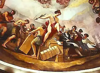 Morris pursued an array of reforms designed to boost the economy; many of the reforms were inspired by the laissez-faire economic ideas of Adam Smith.[83] Shortly after taking office, he convinced Congress to establish the Bank of North America, the first bank to operate in the United States. Such a bank had been discussed in the months prior to Morris's appointment, but the bank itself was organized along lines laid out by Robert Morris and Gouverneur Morris. It was established as a private institution governed by its investors but was subject to inspection by the Superintendent of Finance. The bank would take the national government's deposits, provide loans to Congress, and issue banknotes. Morris hoped that the bank would help finance the war, stabilize the nation's currency, and bring the country together under one unified monetary policy.[84] As the bank would take some time to begin functioning, in 1781 Morris presided over the issuing of a new currency, referred to as "Morris notes," backed by Morris's own funds.[85] Morris also convinced Congress to allow him to purchase all supplies for the Continental Army, and Congress required states to furnish funding rather than supplying goods like flour or meat.[86]