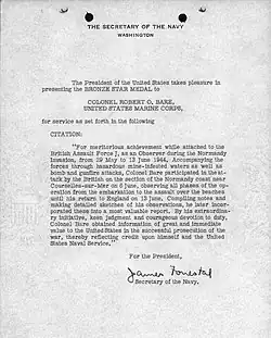 Another important assignment came in June 1943, when Bare was transferred to London and assigned to the staff of Naval Commander-in-Chief of the Allied Naval Expeditionary Force, Admiral Bertram Ramsay as staff officer for plans. He participated in the planning of the Invasion of Normandy and later observed British Assault Force "J" attacking German forces near Courseulles-sur-Mer, incorporating his observations into his report. He was later decorated with the Bronze Star Medal with Combat "V" for his service in this capacity.[1][2][5]