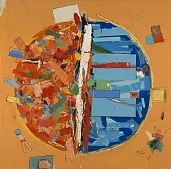 His next series, Pedazos Del Mundo, begun in 1961, is the first of Neuman's series to prominently utilize symbolism as a means of expression and has become his most celebrated body of work. When speaking of the series, Neuman has remarked, "The world is in pieces culturally: liquids, solids, gases, languages, every way you can think about it... so I painted a circle and I made it in pieces”.[21] Pedazos exhibits "the full bloom of the graphical flair and unfailing liveliness that distinguishes Neuman’s style for the next half century".[22] Neuman continued to use the symbol of the circle in Space Signs, begun in 1966, by using tin cans, beer bottles, lamp shades and other round objects "to stamp out resplendent orbs of color over pulsating geometric landscapes".[23] Stacks and Piles, begun in 1975, saw Neuman's return to earth. When creating this series he was influenced by cairns, a man-made pile of stones traditionally found on hiking trails. Neuman translated the cairns into heaps of shapes, piled skyward on canvases that reached upwards of eight feet high.[24]
