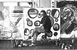 Neuman has worked on 16 series of paintings, including his earliest and most recent works, each representing a response to a different symbol, place or idea in a distinct visual language. His earliest works reflect post-war America and are filled with ominous and dark titles and color palettes. Neuman explored this theme by experimenting with different medium, such as duco paint and sand on masonite and a new, abstracted subject matter.[18] Neuman's first major series was The Black Paintings. This series was catalyzed by his experience studying in a still war- ravaged Germany as a Fulbright Fellow in 1953 under the tutelage of German Expressionist, Willi Baumeister. The Black Paintings’ uncharacteristically dark color palette was influenced by "the reactionary impulses to World War II that had rippled through the art world".[19] Today, The Black Paintings serve as a glimpse into the lingering desolation of Germany in the 1950s by one of the few American artists to witness it first-hand.