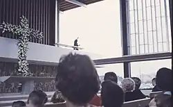 Ground was broken September 10, 1958 for construction of Schuller's second church-home in the area, which was designed by international architect Richard Neutra. This second church was completed in 1961, at a cost of $3 million[15][16] (equivalent to $32 million in 2024). The dedication service was held November 5, 1961.[17] The design of the new church building enabled Schuller to preach his sermons to worshipers in 500 cars, as well as to members of the congregation inside the church.[18] Schuller's second area church was built on what was to later become a part of the campus of his future (and much larger) "Crystal Cathedral Church."[3]