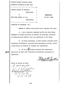 Despite the risk of prosecution, Smith signed an affidavit in support of the Times in the Pentagon Papers case in federal court. The affidavit said Smith regularly received classified information from United States government sources.[21]