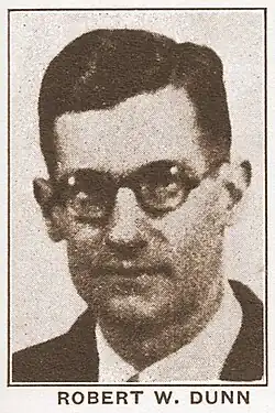 After graduation from Yale with a Bachelor's degree in 1918, Dunn went to work for A.J. Muste as the secretary of Muste's Union for Democratic Control in Boston. He became the general organizer for Muste's nascent Amalgamated Textile Workers Union (ATWU) the following year.[2] After a raid on ATWU headquarters during the First Red Scare, Dunn was briefly held on charges of conspiring to overthrow the government.[2]
