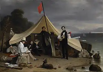 Exhibits at the National Academy of Design frequently included Weir's paintings – seventeen in 1832 alone. Many were also engraved and published in The Token and Atlantic Souvenir annual gift book, reaching a wider audience. Among those are Greek Lovers (1830), Bourbon's Last March (1835), Sunset on the Hudson (1850), and The Spy (1836), the last of which being inspired by James Fenimore Cooper's 1821 novel of the same name.[14]