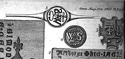 Wheler felt that the only way to authenticate the ring as having belonged to Shakespeare might be to find an impression of the seal on a letter or a document signed by Shakespeare.[1] Still later that same day, March 16, Wheler wrote a letter to The Gentlemen's Magazine, as part of his efforts to discover such a document. In his letter Wheler requested the magazine's readers to find any letters written by Shakespeare, and have them inserted into the pages of the "extensively-circulated [Gentleman’s] Magazine, with fac-similes of the signatures, and of any seals” still attached."[2] He didn’t hint at the discovery that had been made that day, which was the reason he was asking,[3] but he did say that for such an acquisition he was "particularly anxious".[2] His letter received no response. In his next letter published in the Gentlemen’s Magazine, Wheler included illustrations: the seal ring, an impression made by the seal ring, and Thomas Lucy’s string-and-tassels design.[3]