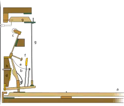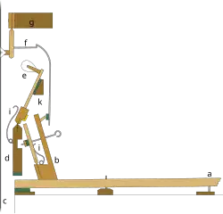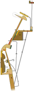 In 1826 Wornum patented improvements to what he called in the specification the professional piano, claiming a pizzicato pedal positioned between the two ordinary pedals and operating linkages arranged to press the dampers against the strings,[43] a pinned single action where the damper lever was raised by a button at the end of a wire attached to an extension on the sticker[44] and two double actions with additional levers mounted to a second rail for operating the dampers as well as checks for the hammer. The first of these was arranged like the action from his 1811 patent with the backward facing escapement on the key operating the check lever wire; in the second the check lever wire was operated by the sticker. The sticker was pinned to the underside of another lever, hinged to the hammer rail and carrying the escapement.[45] The escapement worked on the principle of the English grand action with the regulating button fixed to the hammer rail,[46] but with its spring mounted on the sticker instead of the lower part of the escapement. A fixed hammer return spring was not shown, and apparently in its place a spring was mounted on the hopper and worked against the hammer butt to prevent the hammer "from dancing after the hand is off the key".[45]